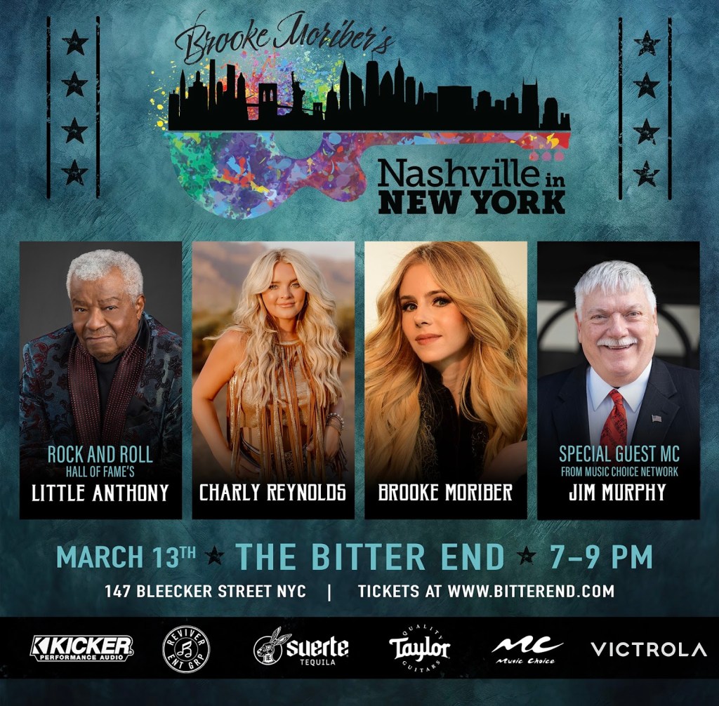 New York, NY – Feb 2025 – Get ready for an unforgettable night of music, stories, and incredible talent at The Bitter End in New York City on Thursday, March 13th when former Broadway star and current Reviver Records country music sensation, Brooke Moriber, will host her bi-monthly “Nashville in New York (NINY)” Songwriters in the Round series. This intimate acoustic performance will showcase Brooke alongside the legendary Rock N Roll Hall of Fame Inductee Little Anthony of The Imperials, and rising country star Charly Reynolds, bringing a Nashville-style songwriting round to the heart of New York City; hosted by guest MC Jim Murphy, Director of Country Programming at the Music Choice Network.