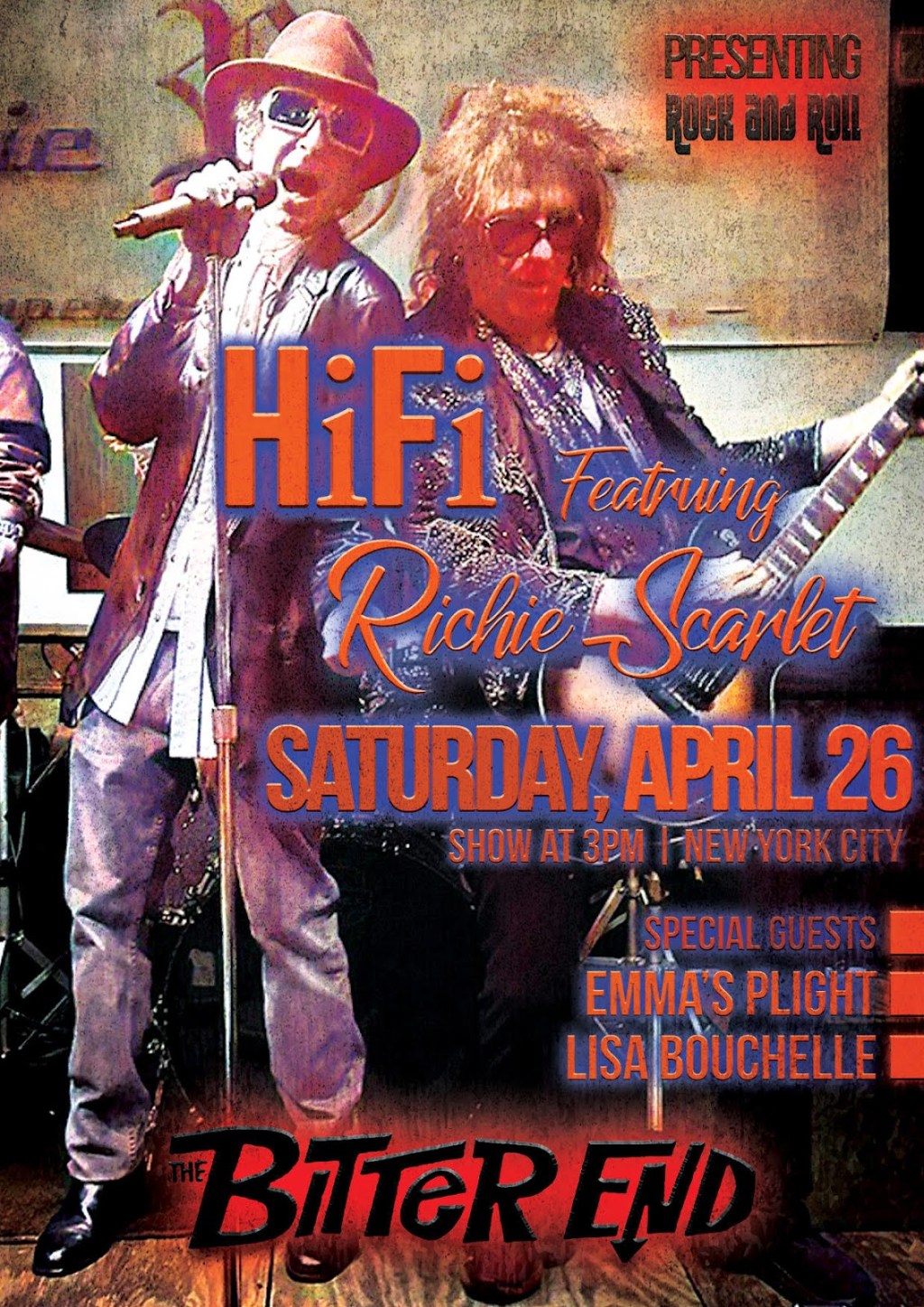 New York, NY – Get ready for a high-energy afternoon of rock and roll as HiFi Featuring Richie Scarlet takes the stage at The Bitter End on Saturday, April 26, at 3 PM. Known for their explosive performances and legendary lineup, HiFi feat. Richie Scarlet will be performing a 45-minute set of original music, featuring “She’s My Girl,” “OH,” “Can’t Stop Rockin,” “Baby Doll,” and more.
