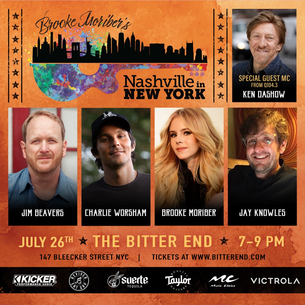 New York, NY – Brooke Moriber’s acclaimed Nashville in New York series returns to The Bitter End on Saturday, July 26th, for another unforgettable night of music, storytelling, and star power. This intimate songwriters’ round will feature performances from country music heavyweights Jim Beavers, Charlie Worsham, Jay Knowles, and Brooke Moriber herself, with special guest MC Ken Dashow from Q104.3 guiding the evening. Taking place from 7–9 PM at the legendary venue located at 147 Bleecker Street, NYC, the event brings the heart of Nashville to downtown Manhattan.