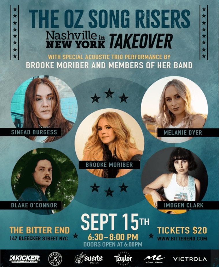 New York, NY – The acclaimed Nashville in New York series returns to The Bitter End on Monday, September 15th, for a special Oz Song Risers Takeover. This unforgettable evening will showcase some of Australia’s finest rising country stars, Sinead Burgess, Melanie Dyer, Imogen Clark, Blake O’Connor, and host artist Brooke Moriber. Brooke will also perform a special acoustic trio set with members of her band.