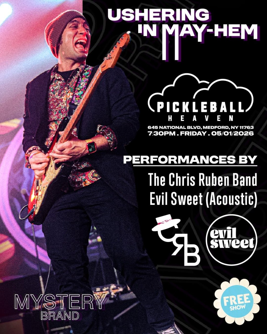Kicking off on Friday, May 1 at 7:30 PM, the opening night event titled “Ushering in May-hem” will feature performances by The Chris Ruben Band and Evil Sweet (Acoustic) at Pickleball Heaven, located at 645 National Blvd in Medford. The show is free to attend, setting the tone for an accessible, high-energy series designed to bring people together through music and creativity.